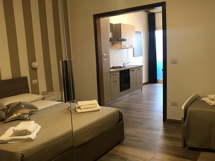 - La camera è attrezzata anche di un ampio balcone e di bagno privato, dotato di wc, doccetta bidet, box doccia, lavandino e set di biancehria da bagno completa.
